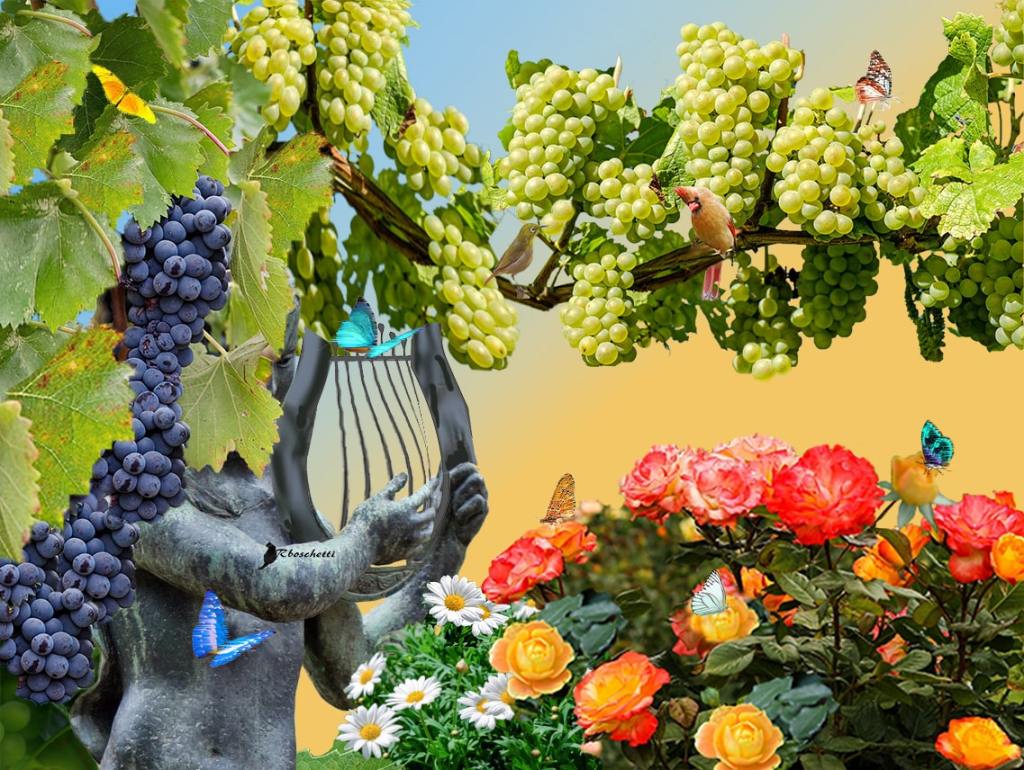 Pronto la viña comenzó a captar alimentos y a nutrirse, la savia viajó hasta hacer aparecer los primeros brotes. Así que busqué mi lira, era importante su música para atender a esas pequeñas flores hasta convertirlas en hermosos racimos de uva.