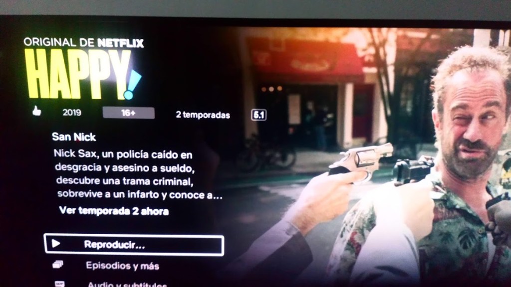 Happy! (2017) basada en el comic book del mismo nombre creada por el escritor, Grant Morrison y Darick Robertson con las actuaciones de Christopher Meloni como Nick Sax; Bryce Lorenzo como Hailey Hansen y Patton Oswalt como la voz de Happy, hicieron que me enganchara a esta serie que de momento tiene dos temporadas.