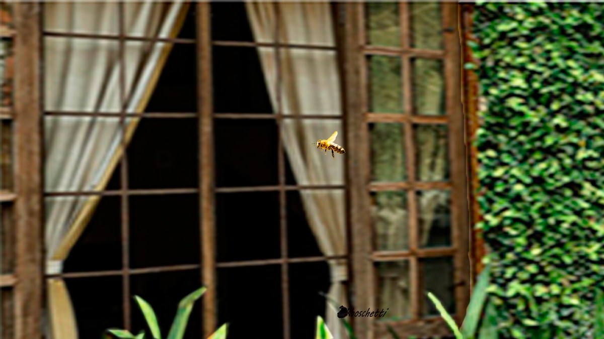 En el jardín el sol brilla. El viento empezó pronto a mover hojas y ramas con fuerza, pero envolvió a Apis con suavidad. En su vuelo ella mueve las antenas con determinación y analiza el entorno.