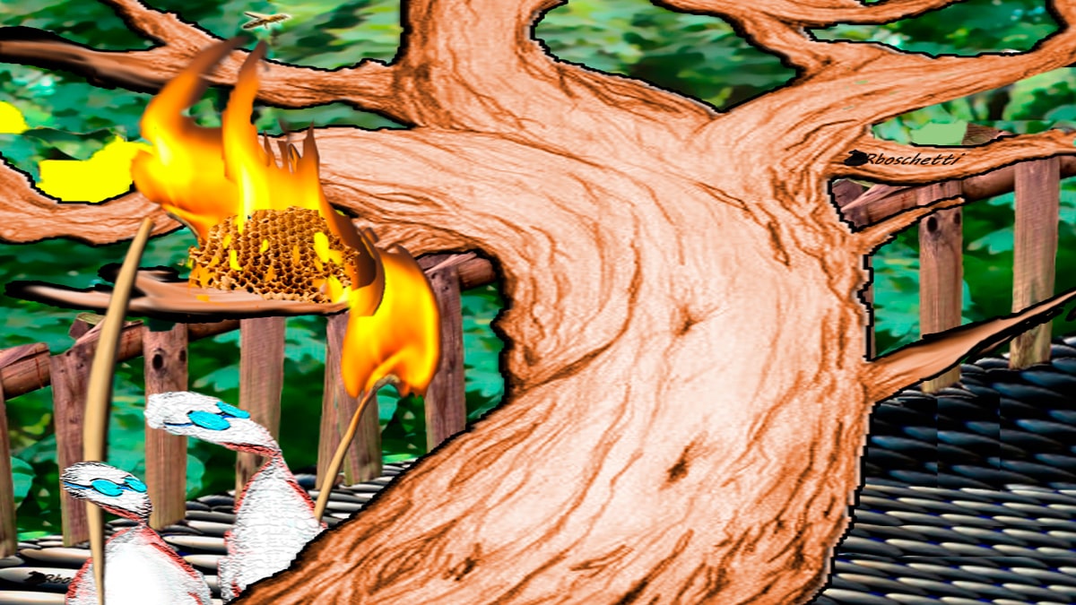Apis Apidae agradece las palabras del palomo con ojos llenos de experiencia. Ella y Apis Mellifera siguen su consejo: Vuelan alto para llegar a las colmenas, pero deben atravesar esas calles y llegar hasta las llamadas granjas. Vuelan lo más rápido que pueden, esquivan objetos impregnados en llamas hasta que Apis Apidae siente el fuego que la abraza muy a su pesar. En su impotencia por ser usado el fuego se disculpa, lo único que puede hacer ahora por ella es intensificarse para entregarla lo más rápido posible a la muerte que la espera con dulzura y ansiosa de eliminar el dolor producto del ataque. En sus brazos, Apis Apidae tiene el tiempo suficiente para observar como Apis Mellifera, su sucesora, vuela apresurada al encuentro con las reinas. Un nuevo tiempo está por comenzar.