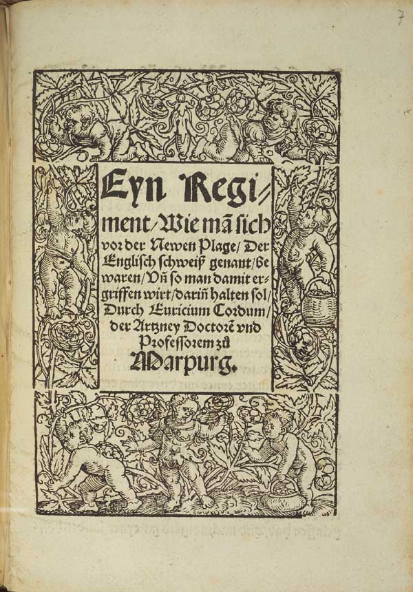Portada de Der Englische Schweiß, estudio sobre el sudor inglés de Euricius Cordus en 1529.