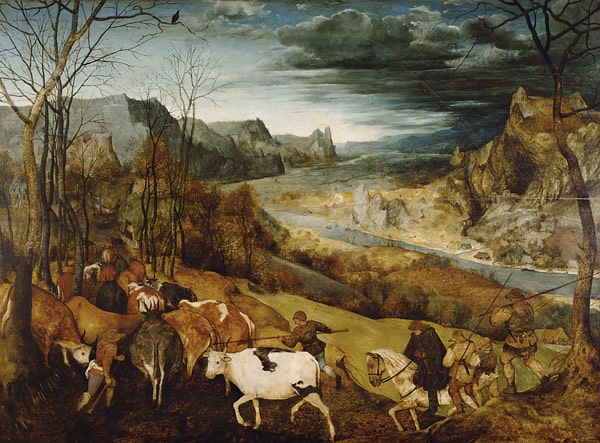 Pieter Brueghel el Viejo: El regreso de los rebaños. El paisaje se ha convertido en el tema principal del cuadro. Brueghel introduce casi siempre la figura humana como anécdota o contrapunto a un universo del que el ser humano solo es una parte, mínima y frágil. Museo de Historia del Arte, Viena.