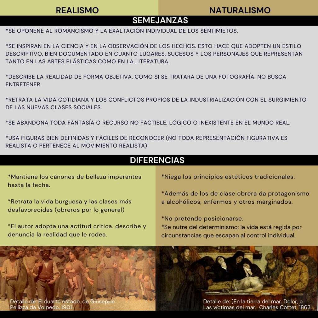 Enumeradas las características de cada uno, se ven claramente sus similitudes, pero Realismo y Naturalismo se diferencian básicamente en la postura del artista, en su interpretación: el realista interpreta y se posiciona, el naturalista retrata.