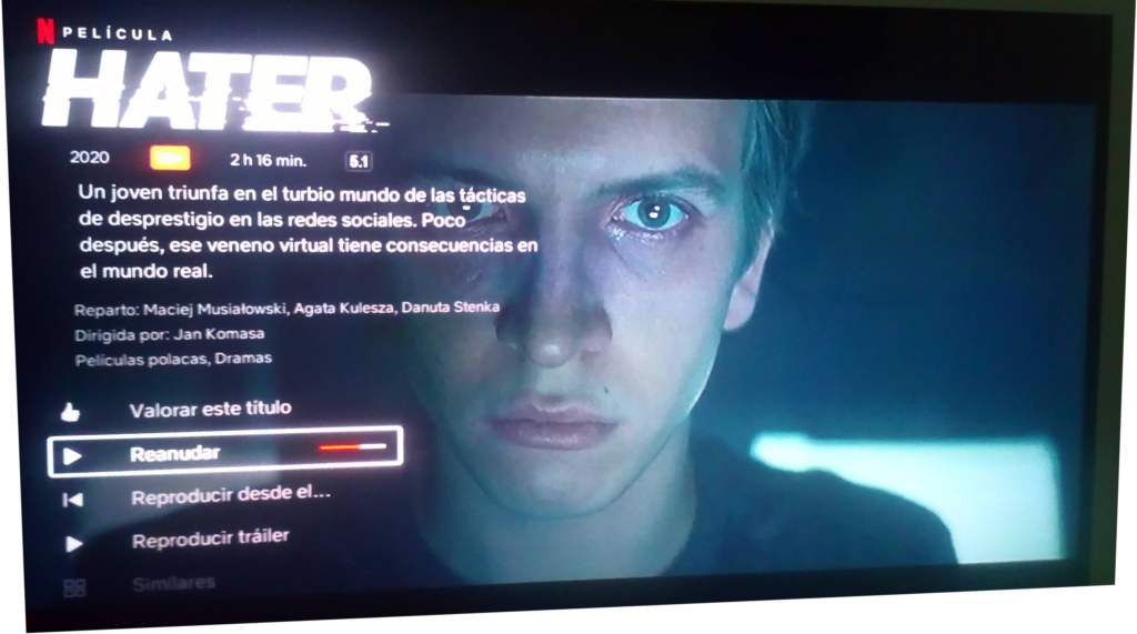 Hater se entiende con independencia de su predecesora Sala Samobójcówes (La habitación del suicidio 2011) del mismo director y en donde al parecer los personajes se entremezclan como un juego. Señala Peter Debruge en el mismo artículo que mencioné arriba «que muchos de los detalles de The Hater se refieren a esa película anterior, que los espectadores curiosos pueden ver gratis a través de Kanopy en los EE. UU. Por ejemplo, el nuevo empleador de Tomasz ( Agata Kulesza) es la madre de la víctima en Suicide Room» Espero que Netflix se apiade de nosotros y nos ponga también la La habitación del suicidio, como saben me encanta eso de tejer con los personajes.