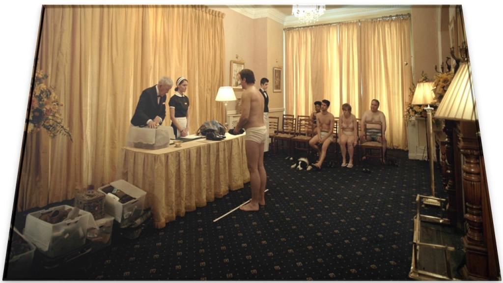Hay un teatrillo que les recuerda a los reclusos/usuarios del hotel las ventajas de vivir emparejados. Son secuencias como de cine mudo solo que requieren la explicación de un locutor para que podamos comprender la escena. Es terriblemente patético que “expliquen” lo que estamos viendo, golpea al espectador de la misma forma que a los reclusos/usuarios. Ahora bien, nosotros recibimos el mismo trato nada más encender la TV, en diversos programas de la vida real.