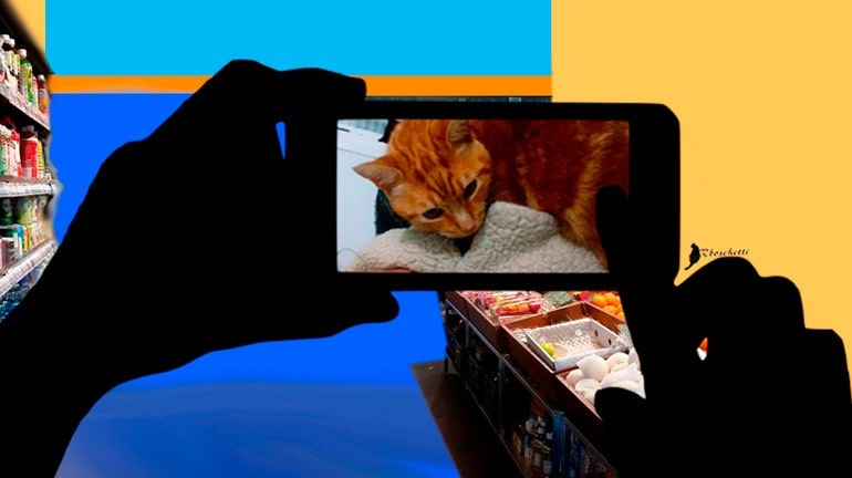 Esta conversación ha llamado su atención, la curiosidad hace que se acerque para intentar mirar la foto sobre los hombros de esas personas. Se da cuenta que es un gato atigrado parecido al suyo. Quiere intervenir en la conversación, pero al no conocerlas se retira con vergüenza. Sin embargo continúa prestando atención, mientras finge pesar algunas verduras.
