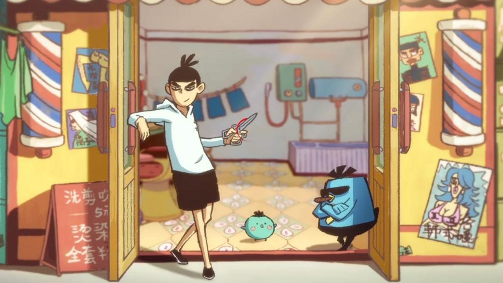 La primera impresión que deja la serie es de ser «ligera» un poco para adolescentes, con chistes propios de la juventud irreverente y un toque absurdo en la animación. Si no se presta atención y se ve de pasada parece un collage de estilos. Eso fue lo que pensé cuando salió el tráiler, luego de no saber qué ver y dejar que el algoritmo de recomendación Netflix hiciese lo suyo. De hecho la dejé pensando que era una especie del El asombroso mundo de Gumball, para adultos. Nada más lejos de la realidad, aunque los primeros capítulos parecen los de una comedia juvenil: encargos que reciben Seven y Dai Bo (el pollo azul con aires de mafioso) en la peluquería que sirve de tapadera para el aspirante a sicario: acabar con el líder del Clan de los Perros, liquidar a una viejecita estafadora que se desvive por su nieto o frenar a un coleccionador de ropa íntima femenina.