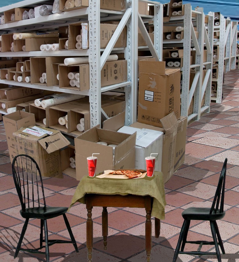 Carmen llega a la pequeña oficina y encuentra a Manuel atareado con unos bultos que acaban de entregarle. Debe organizarlos en los pequeños pasillos creados por muchos estantes dispuestos como un laberinto.