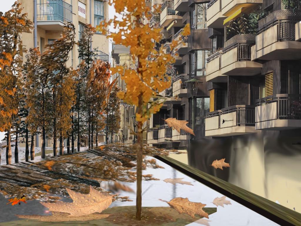 Comienza la tarde y las hojas bailan una danza solitaria antes de caer al suelo y unirse a las otras danzarinas en un gran remolino. Las calles desoladas y lluviosas muestran un panorama desierto de seres vivos, tan solo el viento, la tímida lluvia y ellas mantienen una amena conversación, mientras que las copas de los árboles parecen discrepar de esa charla y se mueven con furia.