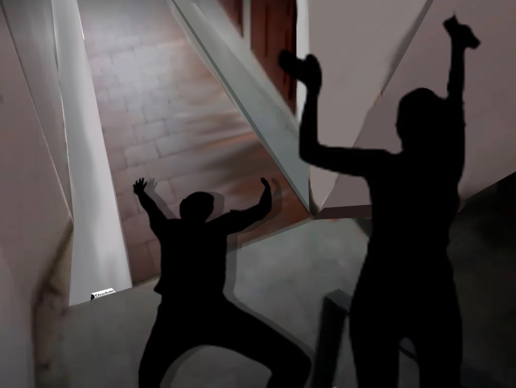 El ensordecedor ruido atrae a muchos. Transeúntes y vecinos observa la escena llena de polvo, restos del cemento y tierra de las macetas que envuelven a los dos cuerpos. De la multitud surge el cartero, quien entre frases entrecortadas, también comenta el suceso.