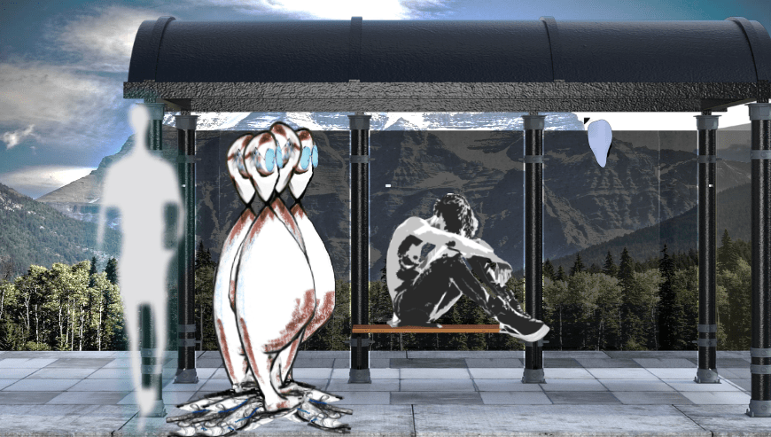 La noche silenciosa se sentó a su lado en la parada de autobús. Al poco tiempo llegó el miedo y se instaló al otro lado. Mientras esperan, el cielo no quiso mostrar sus estrellas. Así llego la oscuridad que también se sentó con ellos.